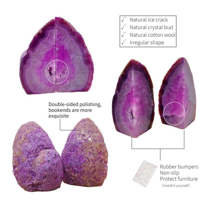 Agate Bookends Natural Crystal Unique Geode Book Ends Dyed Pink For Heavy Books 1 Pair With Rubber Bumpers Xmhome