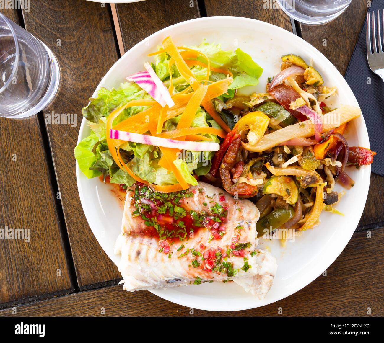 Francese Tradizionale Piatto Di Pesce Cotto Molva Azzurra Di Filetto Con Salsa Saporita Fresca Insalata Verde E Il Saute Vegetale Foto Stock Alamy
